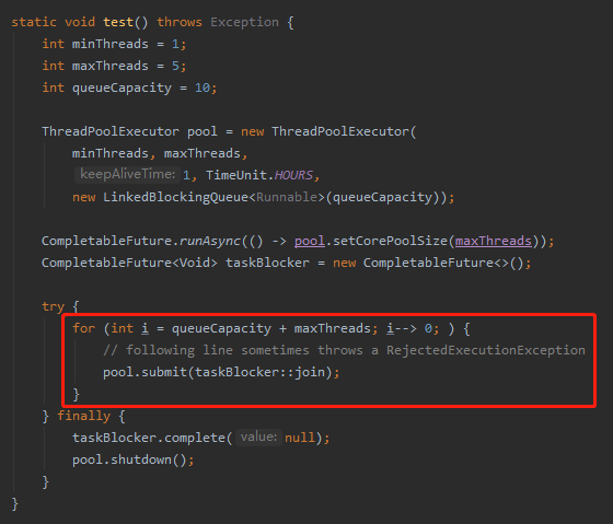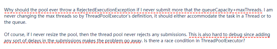 第二个是说原程序中,即提问者给的程序中,使用的是 prestartAllCoreThreads 方法,这个里面必须要调用 addWorker 方法,所以还是有一定的几率出现前面的问题。