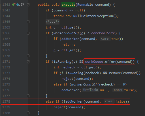 那么问题就变成了:为什么 1378 行中的 addWorker 执行后返回了 false 呢?