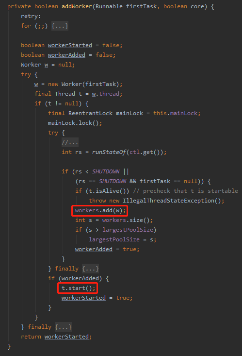你看我框起来的这两局代码,从 workers.add(w) 到 t.start()。