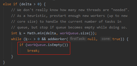 大多数情况下,setCorePoolSize 方法中的 addWorker 执行了后,就会理解从队列里面拿一个任务出来执行。