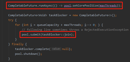 首先我们看一下示例代码里面操作线程池的这两个地方: