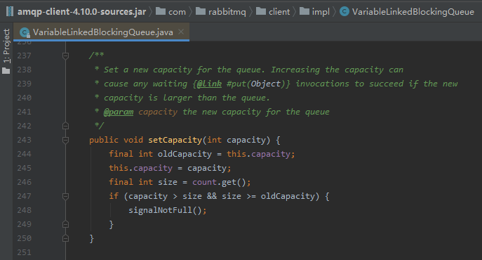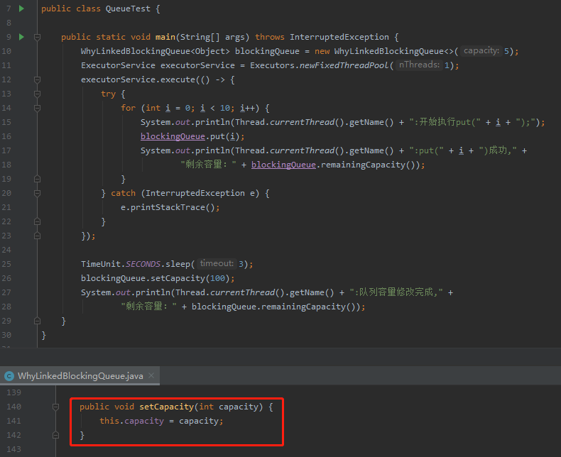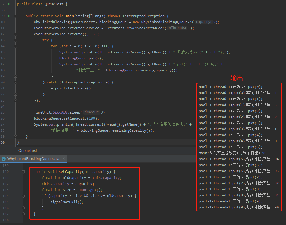 就是把 LinkedBlockingQueue 粘贴一份出来,修改个名字,然后把 Capacity 参数的 final 修饰符去掉,并提供其对应的 get/set 方法。