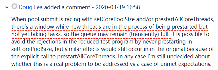 在新线程处于预启动但还没完全就绪接受队列中的任务的时候,会有一个短暂的窗口。在这个窗口中队列还是处于满的状态。