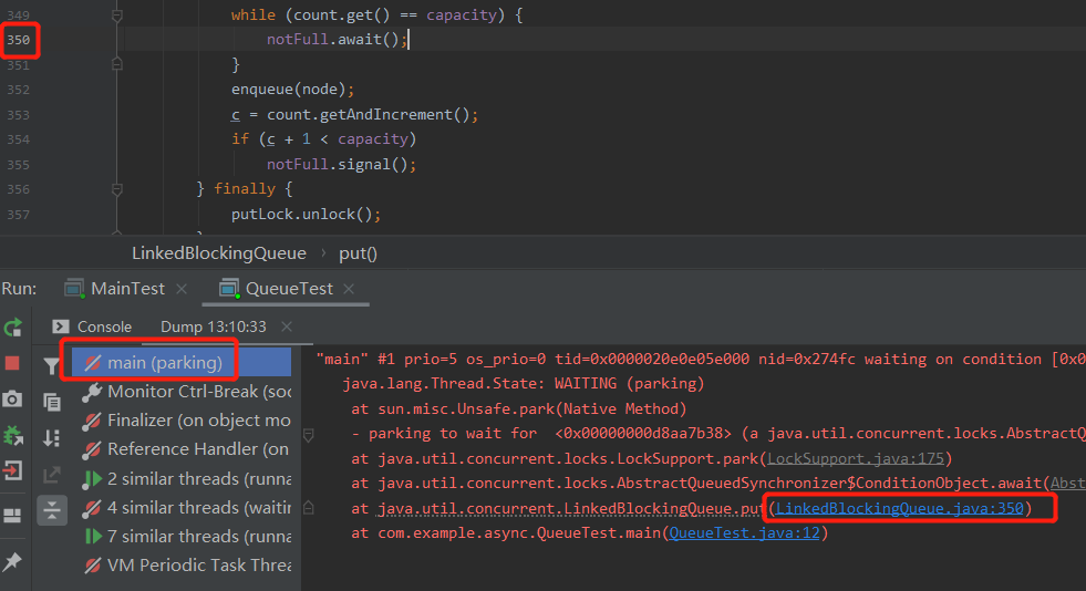 通过 dump 当前线程可以知道主线程确实是阻塞在了我们前面分析的地方: