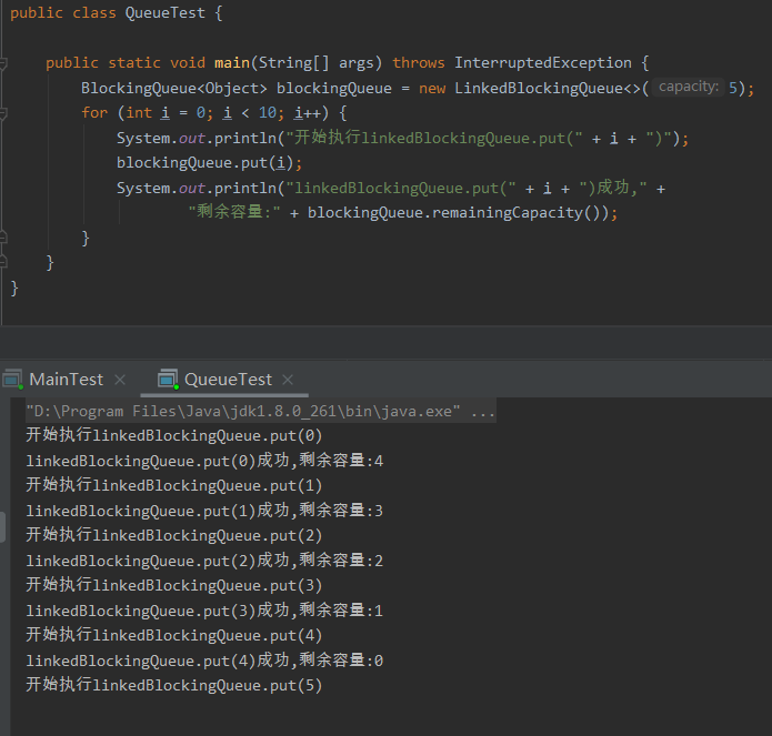 申请一个长度为 5 的队列,然后在循环里面调用 put 方法,当队列满了之后,程序就阻塞住了。