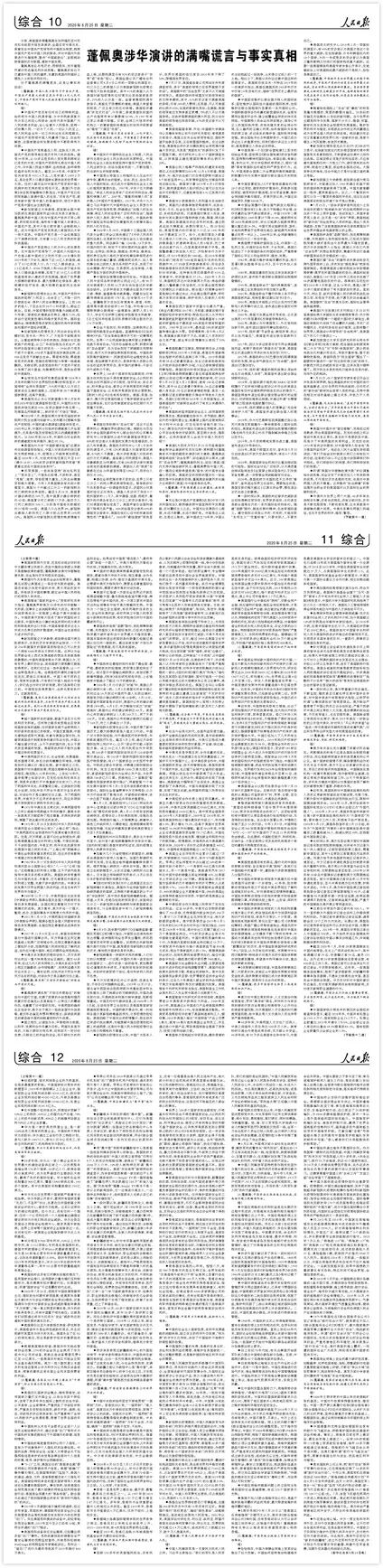 可是,现在必须说,这种想法完全错了,这是一种乐观的、过于自信的判断。因为,就在8月25日,《人民日报》在第10版、第11版和第12版,用了整整三个版面,刊登了题为“蓬佩奥涉华演讲的满嘴谎言与事实真相”,火力全开,对蓬佩奥进行了全方位立体打击,可以说弹雨横飞,火光四溅,将这位现任国务卿、总统特朗普的最高外交官,再次批得体无完肤。