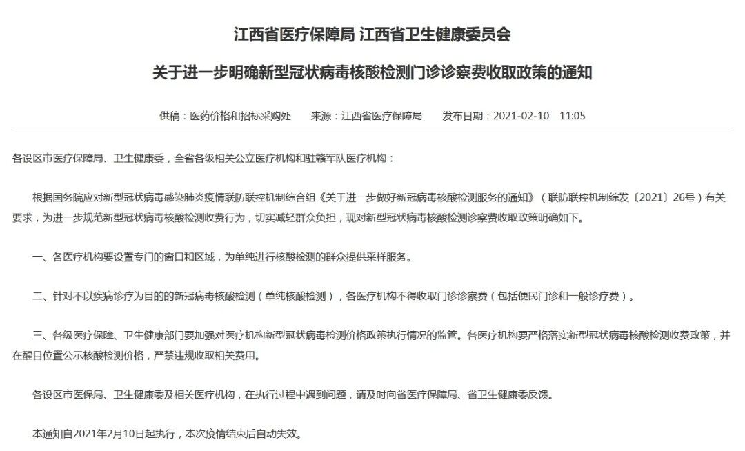 2月10日,江西省医疗保障局、江西省卫生健康委员会也联合发布了《关于进一步明确新型冠状病毒核酸检测门诊诊察费收取政策的通知》,通知明确,2月10日起,针对不以疾病诊疗为目的的新冠病毒核酸检测(单纯核酸检测),各医疗机构不得收取门诊诊察费(包括便民门诊和一般诊疗费)。
