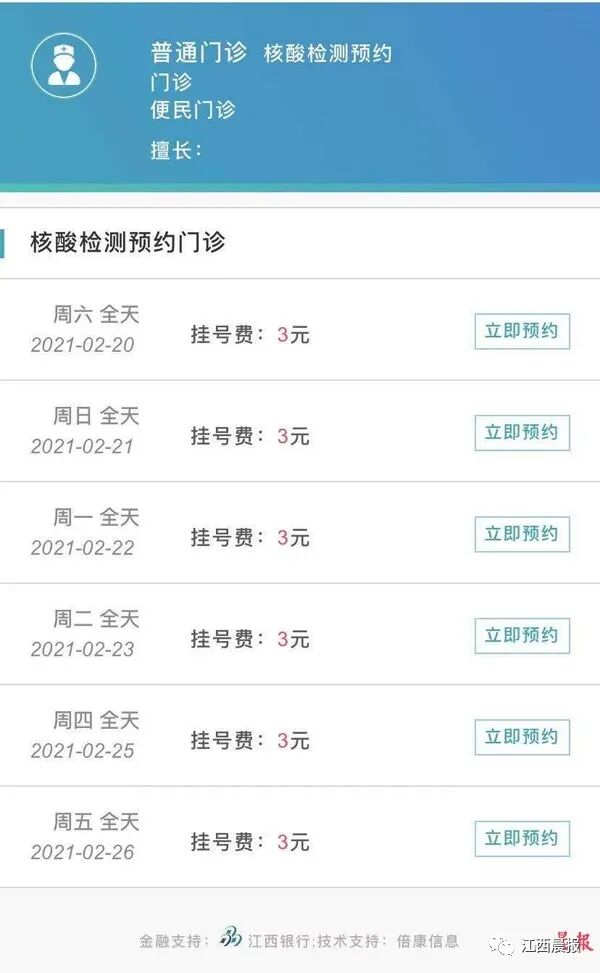 在南昌大学第一附属医院、南昌大学第二附属医院,记者看到不少因工作需要做核酸检测市民,同样只缴纳了65元的检测相关费用,没有任何额外收费。而在南昌市第一医院等医疗机构,记者却发现单纯做核酸检测仍要收取门诊诊查费。南昌市第一医院挂号收费窗口一名工作人员告诉记者,做核酸检测需要到窗口处挂号,要收取挂号费,但是线上挂号不收取费用。记者按照工作人员的说法,进入南昌市第一医院官方公众号预约挂号,仍然显示要收取3元的挂号费。