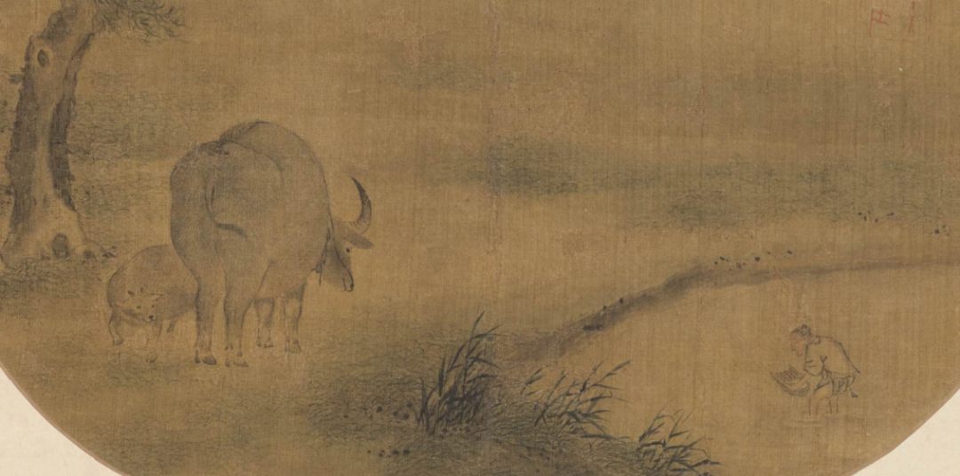 《柳下双牛图》的画面主体则是一对在夏日农闲时自由放牧的母子牛,可见牛在以农为本的古代社会中的重要地位。画中母牛脖子上的缰绳不受约束,右侧有一人在水塘中淘洗,表现出了人与牛之间的和谐信赖,整个画面恬谧宁静。