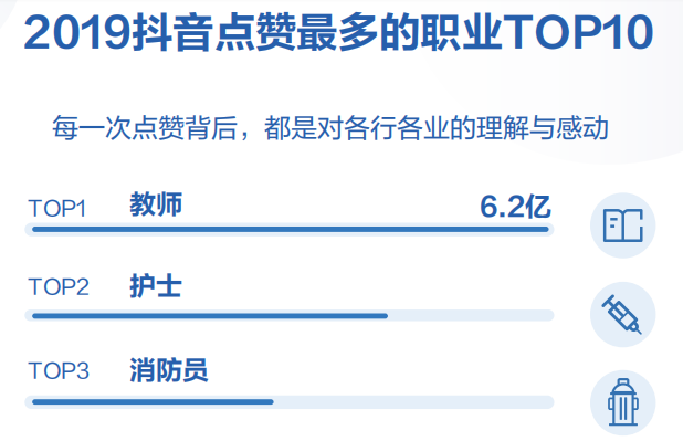2019年,抖音点赞最多的职业是教师,总点赞量高达6.2亿。![]()