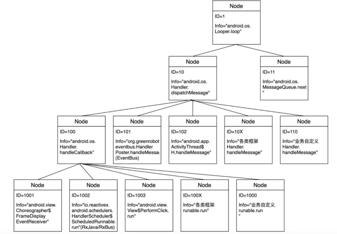 我们利用树来储存主线程的常见堆栈,形成一个堆栈树模版。每一个叶子节点代表一种 Task 类型,拥有着相同的堆栈提取规则,关联着一种堆栈提取逻辑(具体为一个 Funtion 接口的实现)。每捕获一个耗时堆栈,我们遍历这个树找到匹配的叶子结点,通过该叶子结点对应的堆栈提取逻辑来提取出对应的耗时 TaskName。树模型如下图所示,目前仍在不断迭代中。