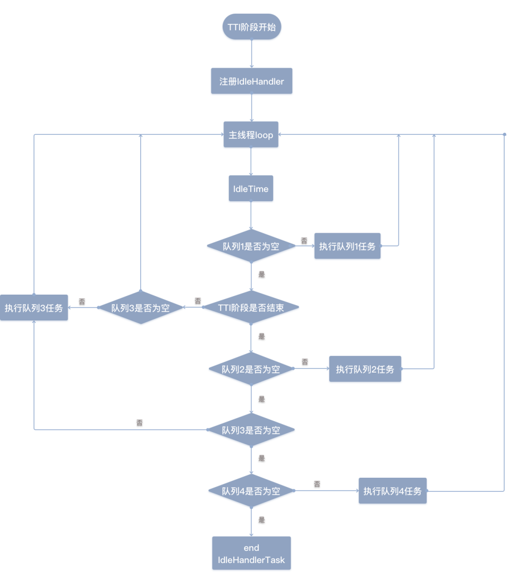 将以上四个不同优先级的任务纳入对应的队列,利用主线程 IdleTime 结合当前是否已经经过 TTI 阶段的 Flag 来决定四类任务的调度情况,总体方案是:主线程 IdleTime 期间可以调度低耗时任务,TTI 阶段结束后方可调用高耗时任务。在同时满足两个条件的情况下,高优任务优先。这样就可以最大限度减少框架任务对 TTI 指标和用户体验的影响。