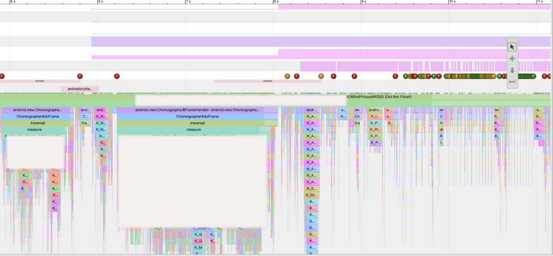 快手内部有既成的线上火焰图方案 Chronos。Chronos 提供了接口给各阶段的业务去抓取线上火焰图,做一些简单的参数配置。比如 TTI 阶段起始和结束的时间点、兜底时间以及 Buffer 大小等即可接入,配合线上开关的命中策略即可抓取用户手机的 Systrace,适用于分析线上单点用户的性能问题。由于目前的 TTI 优化尚未达到瓶颈阶段,所以线上火焰图暂时仅作为补充手段。