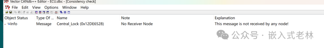 在”File”中选择”Consistency Check”,此时会在一致性检查窗口中输出检查结果。如下:会有状态信息及对应的说明,以供我们检查出错/警告报警的原因。下面出现一条警告信息,说是这个message没有接收的节点