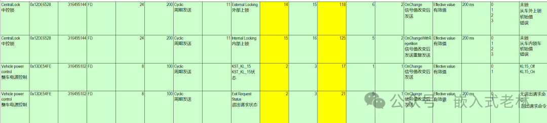 大部分情况,客户是不会给DBC文件的,会给通信矩阵。客户给的需求,CAN通信矩阵部分截图