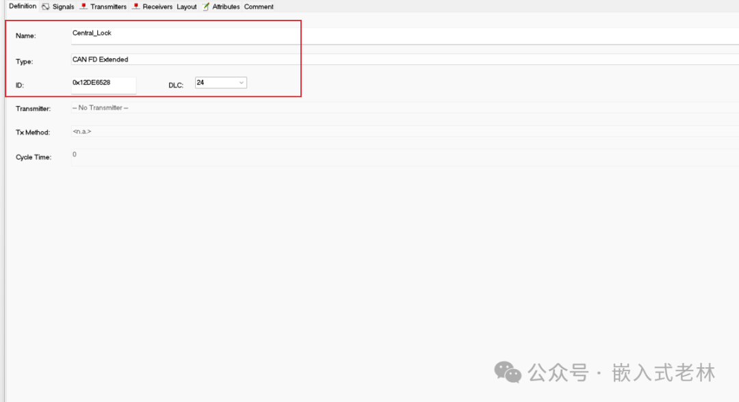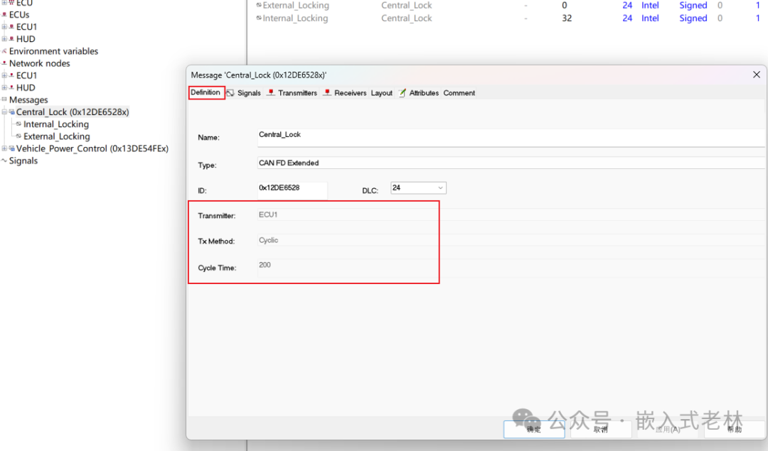 创建message和创建信号类似,方法就不多说了,参考创建信号的描述。下面的按照通信矩阵填就行了