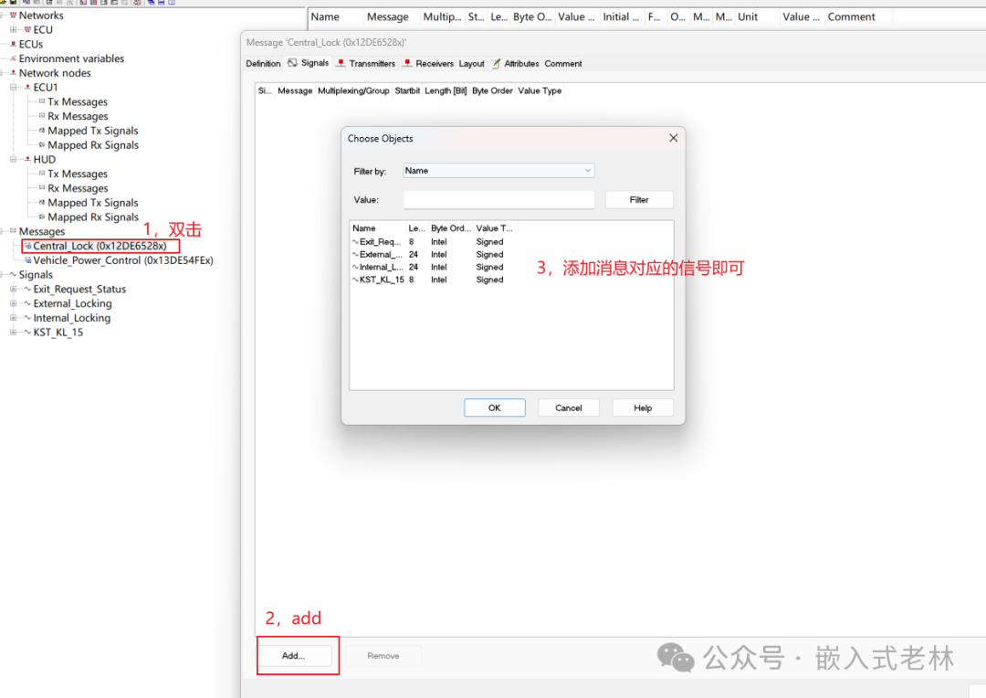 双击对应的message,然后添加message包含的signal就行,如果有很多个signal,可一起选中,一次性添加完