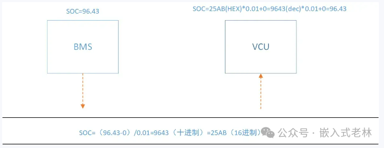 举个例子,在VCU和BMS之间需要传递电量显示信息SOC,BMS软件计算出SOC=96.43,其中规定通讯矩阵Offset=0,Factor=0.01,发送总线后的16进制值(原始值)=(96.43-0)/0.01=9643(十进制)=25AB(16进制),总线数据传输可以通过下图所示: