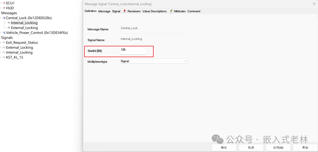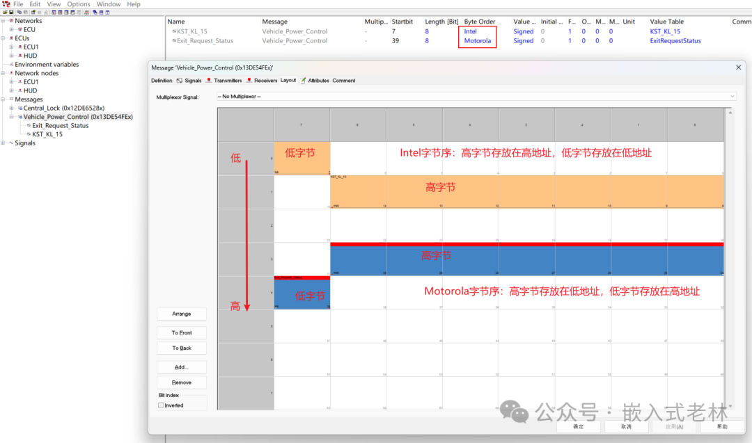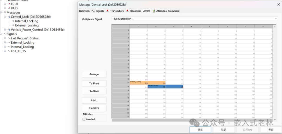 修改一下start bit,也是根据通信矩阵表来修改,可双击message中对应的signal去修改起始位数值,也可双击对应message,进入到layout界面,直接拖动对信号到对应的位置