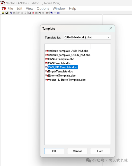 在CANdb++中,选择“File” > “Create Database”,然后选择一个模板并保存,这里选择CAN_FD模板