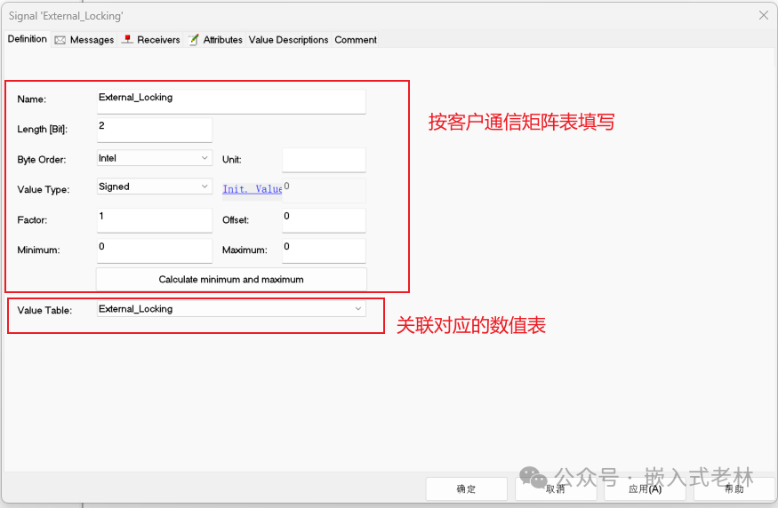 根据通信矩阵中对于该信号的定义进行设置,并关联对应的数值表,点击确定即完成了信号的创建,依次完成剩余信号的创建工作。可以继续New新建,也可以Copy/Paste前面建好的信号,再双击进行修改完成创建,当其他信号的内容和已创建好的很相似就可以复制/粘贴前面建好的信号,这样会更快。