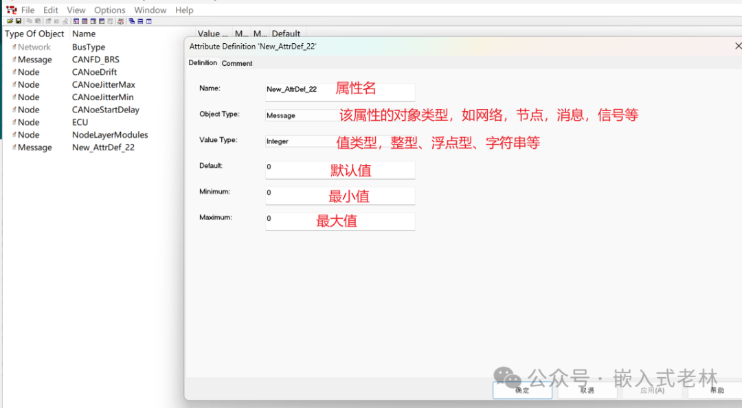 在”View”下点击”Attribute Definitions”,右击选择New,按需要可以进行对报文、信号、节点、环境变量等进行属性创建