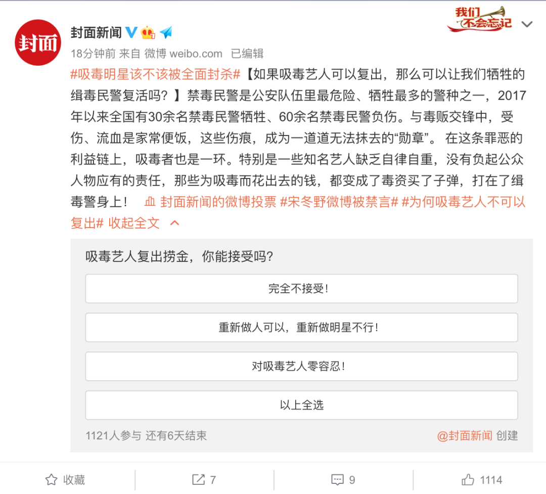 这是一个非常难下笔的话题,除非我像别人那样写《涉毒艺人宋X野复出捞钱?别忘了那些牺牲的缉毒警察》。