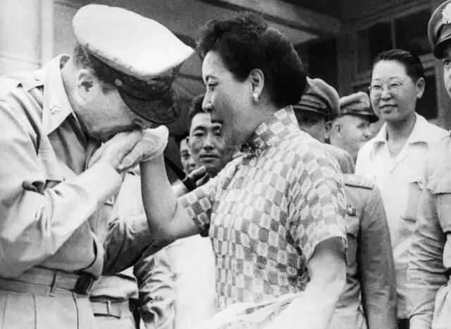 1950年,朝鲜战争爆发之后,美军太平洋战区总司令麦克阿瑟在台湾地区访问期间向宋美龄行吻手礼。
