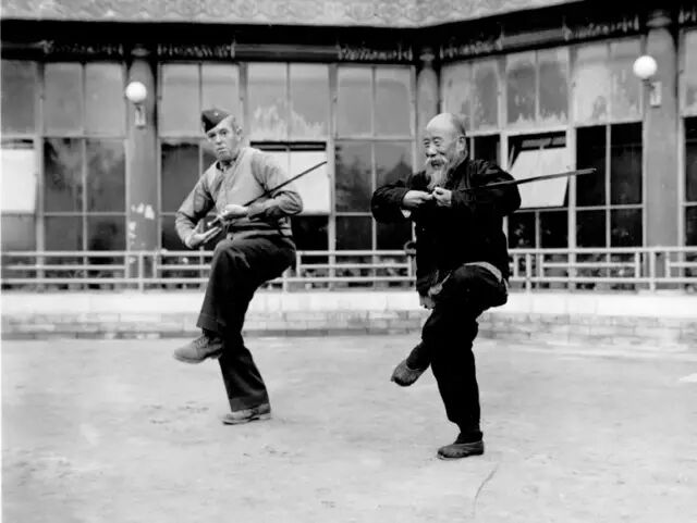 1945年,驻北平的美国海军陆战队军官在向中国老人学剑。