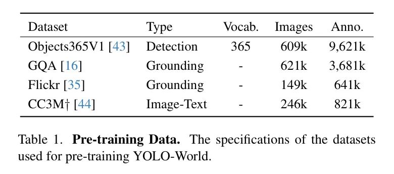 在本节中,作者介绍了在大规模检测、定位以及图像-文本数据集上对YOLO-World进行预训练的训练方案。