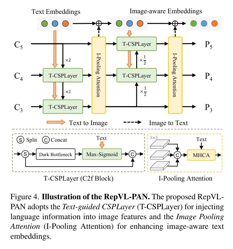 图4展示了所提出的RepVL-PAN的结构,该结构遵循PAN中的自顶向下和自底向上的路径,建立具有多尺度图像特征的特征金字塔。此外,作者提出了文本引导的CSPLayer(T-CSPLayer)和图像池化注意力(I-Pooling Attention),以进一步增强图像特征与文本特征之间的交互,这可以提高开集能力的视觉语义表示。在推理过程中,离线词汇嵌入可以重新参数化为卷积层或线性层的权重以进行部署。