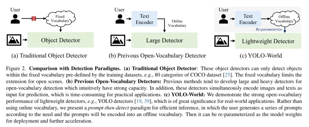 此外,作者探索了一种“提示后检测”范式,以进一步改进实际场景中开集目标检测的效率。如图2所示,传统的目标检测器专注于固定词汇(封闭集)的检测,这些词汇是预定义且经过训练的类别。而之前的开集检测器则使用文本编码器对用户提示进行编码,以实现在线词汇的检测目标。值得注意的是,这些方法往往采用带有重型 Backbone 网络的大型检测器,例如Swin-L,以增加开集的容量。