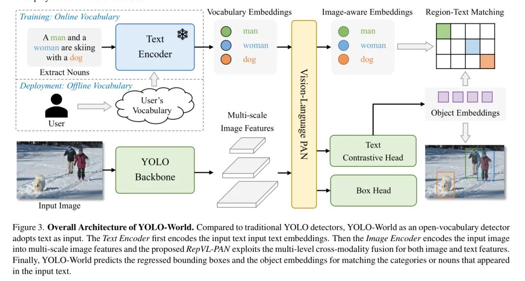 作者提出了一个可重新参数化的视觉-语言PAN模型,用以连接视觉和语言特征,并针对YOLO-World设计了一套开集区域文本对比预训练方案。