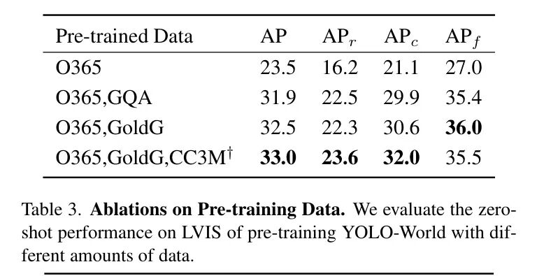 预训练数据。在表3中,作者评估了使用不同数据预训练YOLO-World的性能。与在Objects365上训练的 Baseline 相比,加入GQA可以在LVIS上显著提高性能,AP增益达到8.4。这种改进可以归因于GQA数据集提供的更丰富的文本信息,这可以增强模型识别大词汇目标的能力。