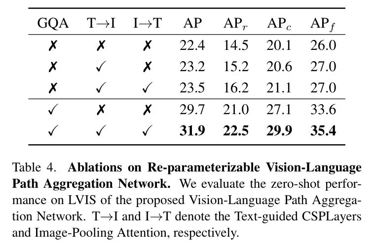 对RepVL-PAN的消融研究。 表4展示了所提出的YOLO-World中的RepVL-PAN对于零样本LVIS检测的有效性,包括文本引导的CSPLayers和图像池化注意力。