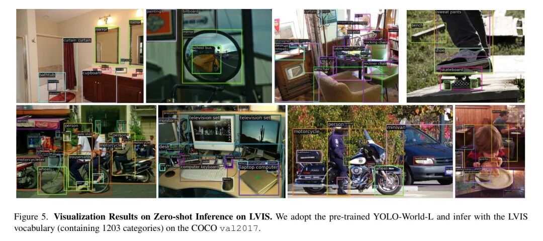 在LVIS上的零样本推理。图5展示了基于LVIS类别生成的可视化结果,这些结果是预先训练的YOLO-World-L以零样本方式生成的。预先训练的YOLO-World展现了强大的零样本迁移能力,并能够尽可能地检测图像中的多个目标。