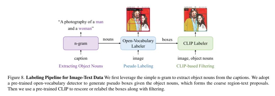 在本节中,作者详细介绍了如何使用大规模图像-文本数据对区域-文本对进行标记,例如CC3M。整个标记流程如图8所示,主要包括三个步骤,即:(1)提取物体名词,(2)伪标记,和(3)过滤。如第3.4节所讨论,作者采用简单的n-gram算法从标题中提取名词。