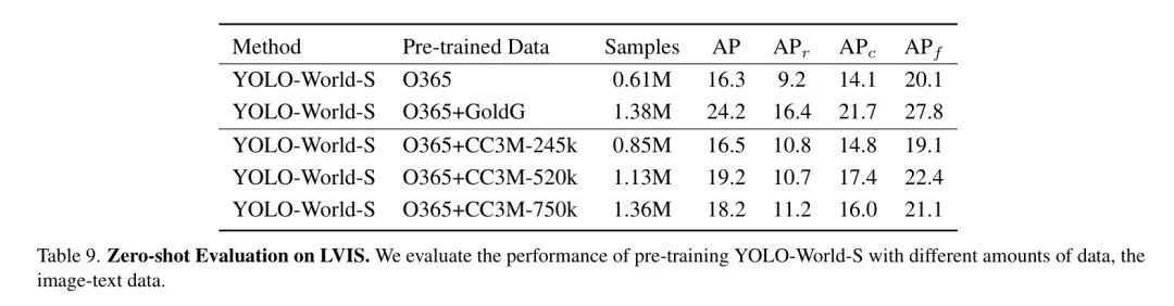 正如表9所示,增加更多的图像-文本样本可以提高YOLO-World-S的零样本性能。表9显示: