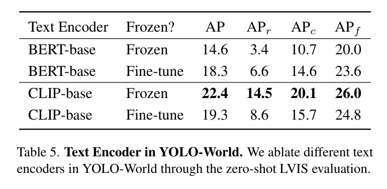 正如表5所示,CLIP文本编码器比BERT获得了更好的结果(在LVIS中罕见类别的AP提高了10.1),这是用图像-文本对进行预训练的,具有更强的以视觉为中心的嵌入能力。在预训练过程中微调BERT带来了显著的提升(+3.7 AP),而微调CLIP则导致性能严重下降。作者将下降归因于在O365上进行微调可能会降低预训练CLIP的泛化能力,因为O365只包含365个类别,并且缺乏丰富的文本信息。