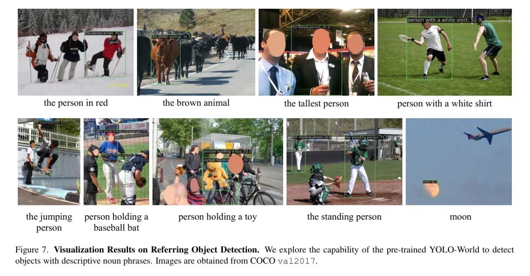 参照目标检测。在图7中,作者利用一些描述性(区分性)名词短语作为输入,例如“站立的人”,来探究模型是否能够定位图像中与给定输入相匹配的区域或目标。可视化结果显示了这些短语及其对应的边界框,证明了预训练的YOLO-World具有参照或定位的能力。这种能力可以归功于作者提出的大规模训练数据的预训练策略。
