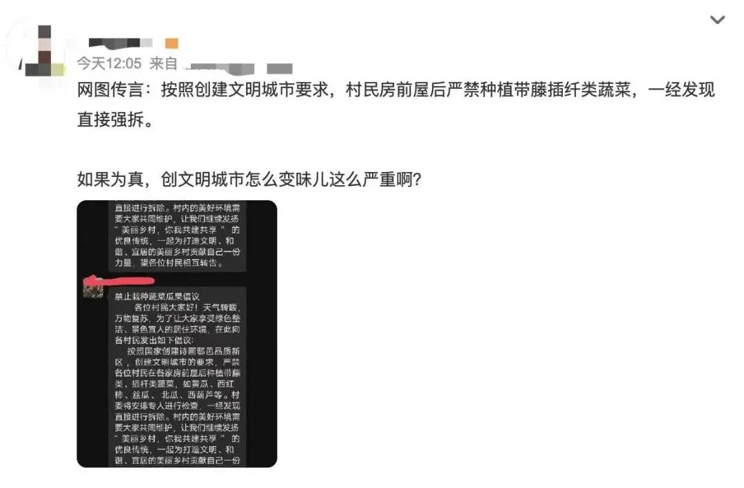 言外之意,严禁村民在房前屋后种菜,是村干部的主意,同街道无关,也跟创建文明城市的要求无关。问题是,当地说了,该村庄属城乡结合部,布局为统一规划建设的2层联排房屋,各家各户无围墙,属于开放庭院。村民在院子里种点蔬菜瓜果,应该是常态。没有上级给的压力,没有上面对村容村貌“突然拔高了”的要求,村干部怎么会一反常态,不让村民种呢?