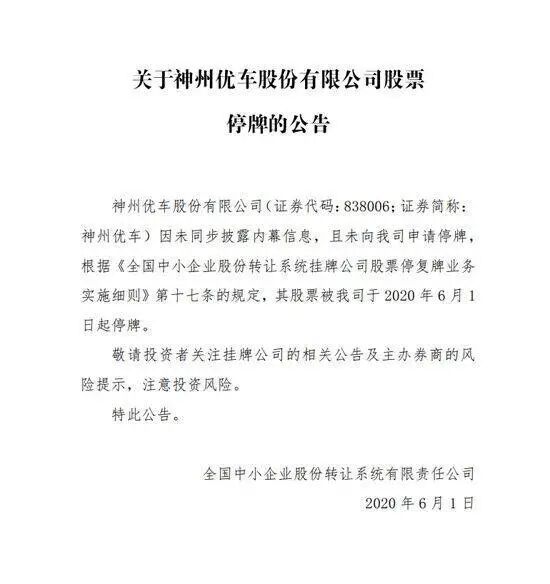 今日(6月1日),神州租车股价突破2港元。从昨日收盘至今日收盘,神州租车股价上涨超23%。但大股东神州优车就没那么好运气了,全国中小企业股份转让系统有限责任公司发布公告称,神州优车未同步披露内幕信息,且未申请停牌,6月1日起被停牌。