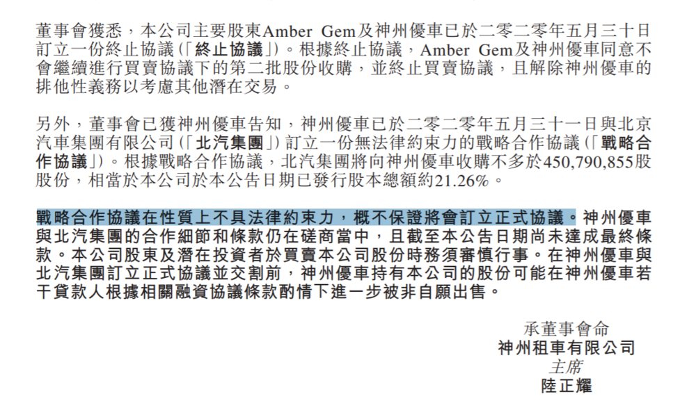 公告强调,“战略合作协议在性质上不具法律约束力,概不保证将会订立正式协议。神州租车与北汽集团的合作细节和条款仍在磋商当中,且截至本公告日期尚未达成最终条款。”
