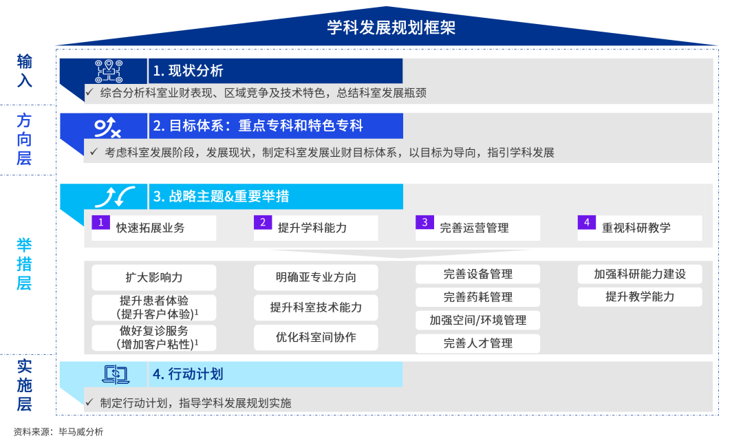 为了助力中国公立医院稳固学科建设规划,实现高质量发展,毕马威提出了以学科规划为例,按照“现状-目标-措施-行动方案”的架构,制定科室发展策略,并通过绩效合约的方式确定年度工作重点和目标追踪方案。