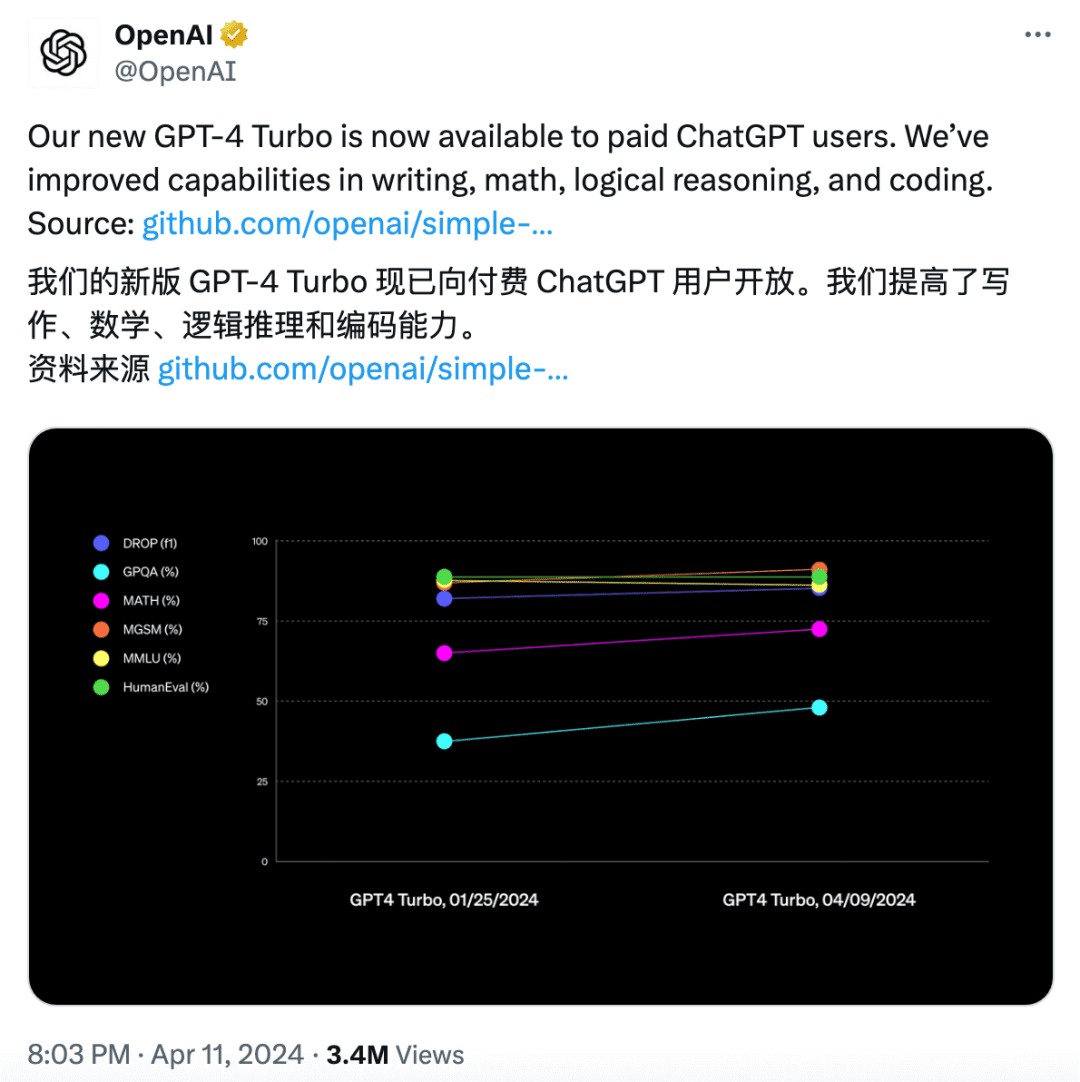 按照OpenAI一贯的调性,一般这种比较重要的更新都是以灰度发布的形式逐步推出的。但没想到,2天后的4月11日晚,OpenAI就再次高调宣布,GPT-4 Turbo已面向ChatGPT用户开放使用,并且放了一张gpt-4-turbo-2024-04-09(这个是最新的GPT-4模型)与gpt-4-0125-preview的基准测试对比图。该帖发布后12小时不到阅读量已超过340万。
