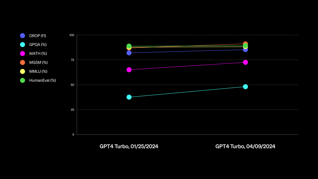 从官方公布的对比图片中可以看出,最新的0409版本的GPT-4 Turbo模型比上一代0125版本在GPQA和MATH上的表现有明显的提升。GPQA 是一个研究生级别的问答基准测试,旨在评估模型对于生物、物理和化学等学科领域的深入理解。MATH 基准测试则使用专门的数学数据集来衡量人工智能的数学问题解决能力。这表明最新的模型在处理高级问题解答和数学问题解决方面的能力有了显著进步。