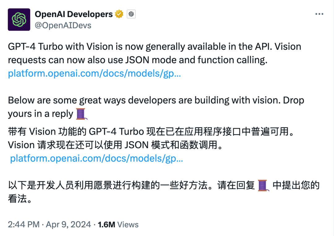 首先是OpenAI开发者账号于几天前的4月9日(北美时间)在国外社交媒体平台官宣了GPT-4 Turbo with Vision这一模型已经可以通过API使用,支持JSON mode以及函数调用。