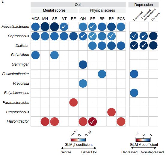 研究人员还收集了队列中志愿者的粪便样本进行分析,他们发现,肠道微生物组成与生活质量之间存在联系,并且筛选出了具有相关性的10个属的细菌。研究人员用另一个来自荷兰的队列对这个结果进行了验证,两个队列共同证明,高丰度的粪杆菌属(Faecalibacterium)和粪球菌属(Coprococcus)细菌与高的生活质量有关,反之,高丰度的黄杆菌属(Flavonifractor)与低的生活质量有关。