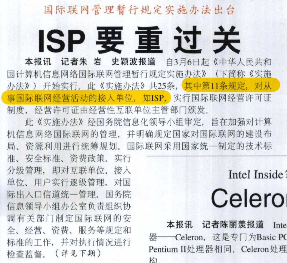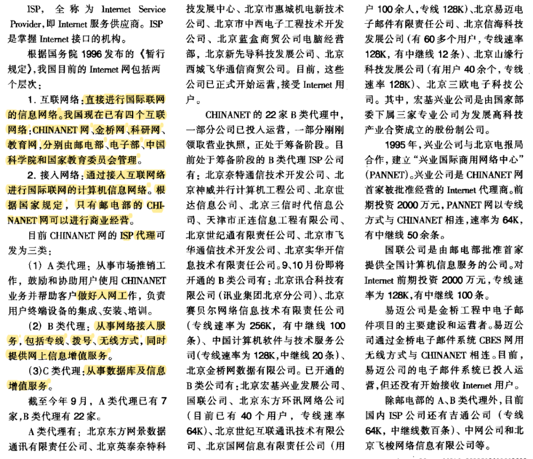 而在当时,普通用户普遍联网的方式系电话拨号(仍存在于笔者小时候的模糊记忆中,即只要使用电话,就会断网)。而开通诸如电话拨号等网络接入服务,惯常的做法并非系直接找前述四家互联单位申请联通网络,而是一般通过二级ISP代理商——其地位就如同中国电信等运营商在各地成立的分公司。