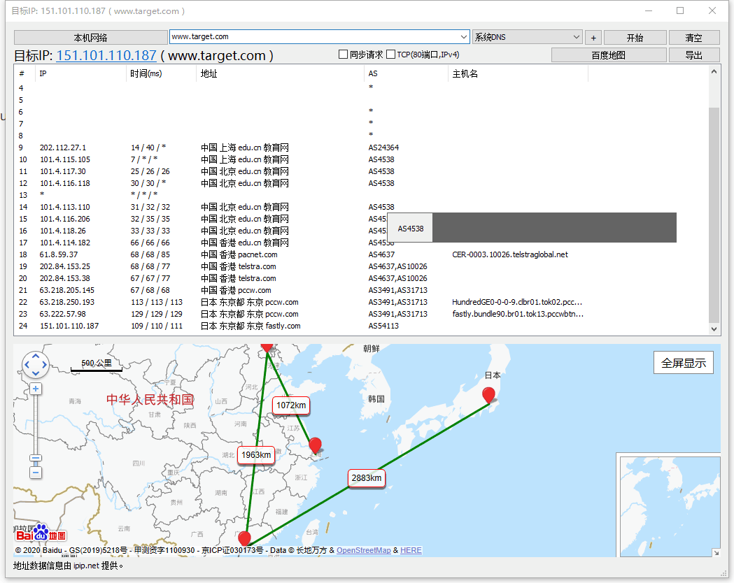 在此前的文章中,笔者曾亲自通过traceroute验证了“翻墙行为”经过了中国电信骨干网以及CN2出入口信道,而这次借同学的测试亦证明:使用学校网络进行“翻墙”通过了教育网AS4538骨干网。